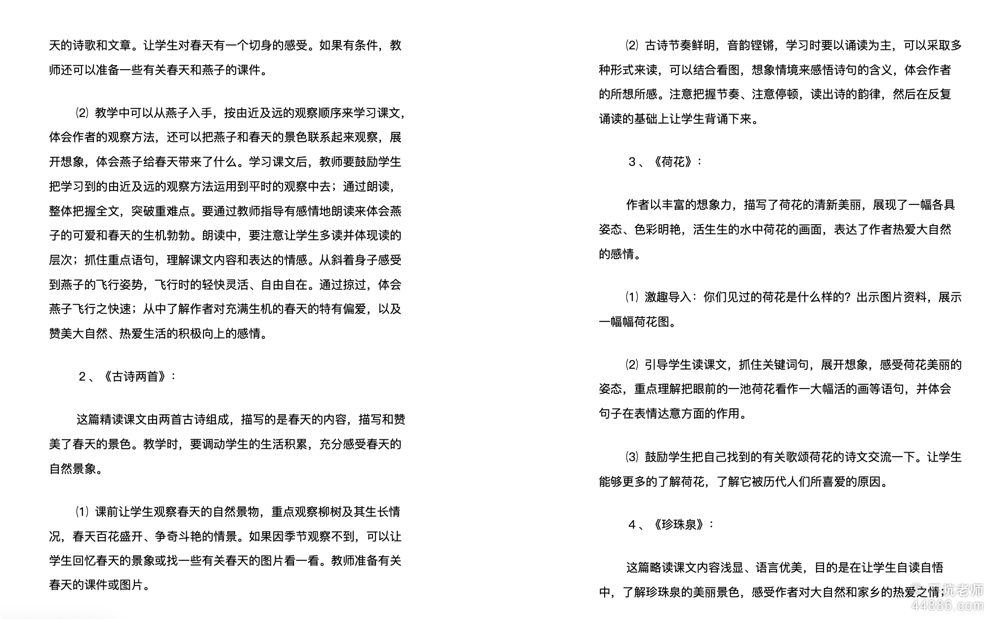 本单元以感受大自然的美好为专题,采用三精带一略的形式构建,选编了精读课文《燕子》《古诗两首》《荷花》,略读课文《珍珠泉》,一个语文园地。自然景物旖旎绚丽,四篇课文视角迥异,各具特色:呢喃的紫燕、婀娜的柳丝、出淤泥而不染的荷花和如珍珠般的泉水,这些美景在作者的笔端涓涓流淌,点点入胸的鲜活文字更激发了学生热爱大自然的美好情感。学习本组课文,教师要引导学生反复诵读,揣摩语言文字在表情达意方面的作用。品味赏析之余还可以从中了解作者的观察方法,积累优美的句段。通过说、写及课外搜集活动,扩大对大自然景物的了解,感受家乡和大自然景物的美好。